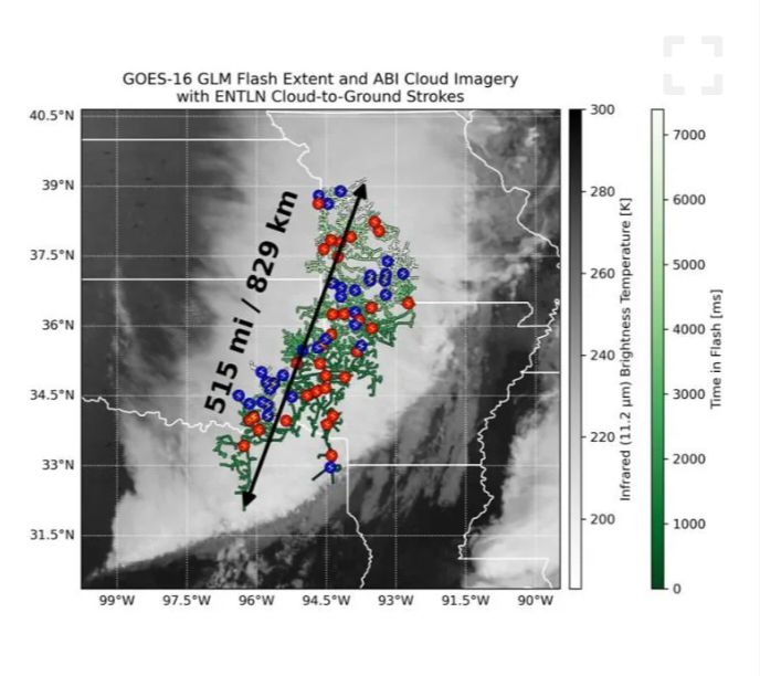 കിഴക്കൻ ടെക്സസ് മുതൽ കാൻസസ് സിറ്റി വരെ 515 മൈൽ (828.8 കിമീ ) ദൂരം നീണ്ടുനിൽക്കുന്നതായിരുന്നു ഈ റെക്കോർഡ് ഇടിമിന്നൽ.